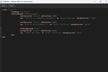El motor tiene su propio sistema de scripts llamado VNScript. Tienes un ejemplo de como se ve en la segunda imagen de la preview del motor.